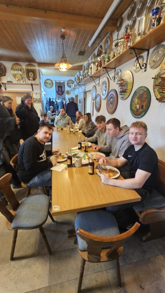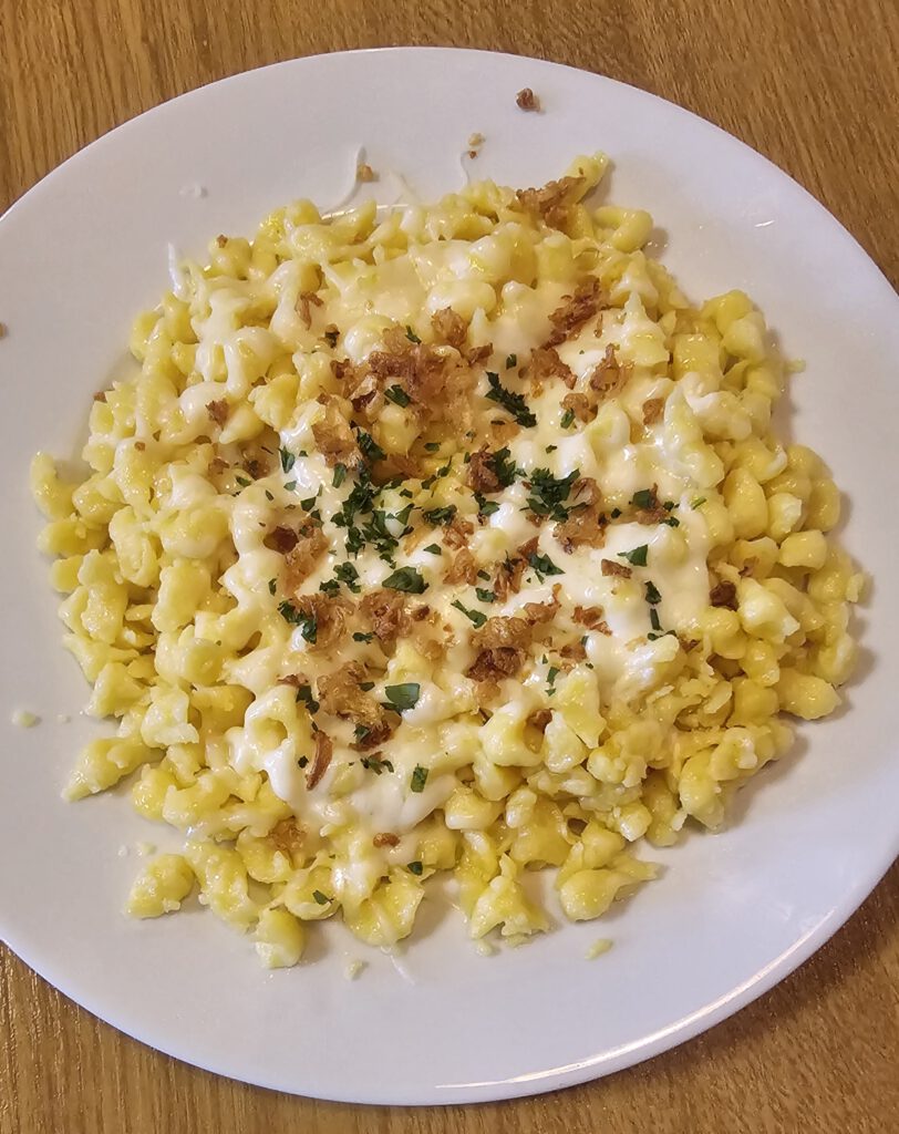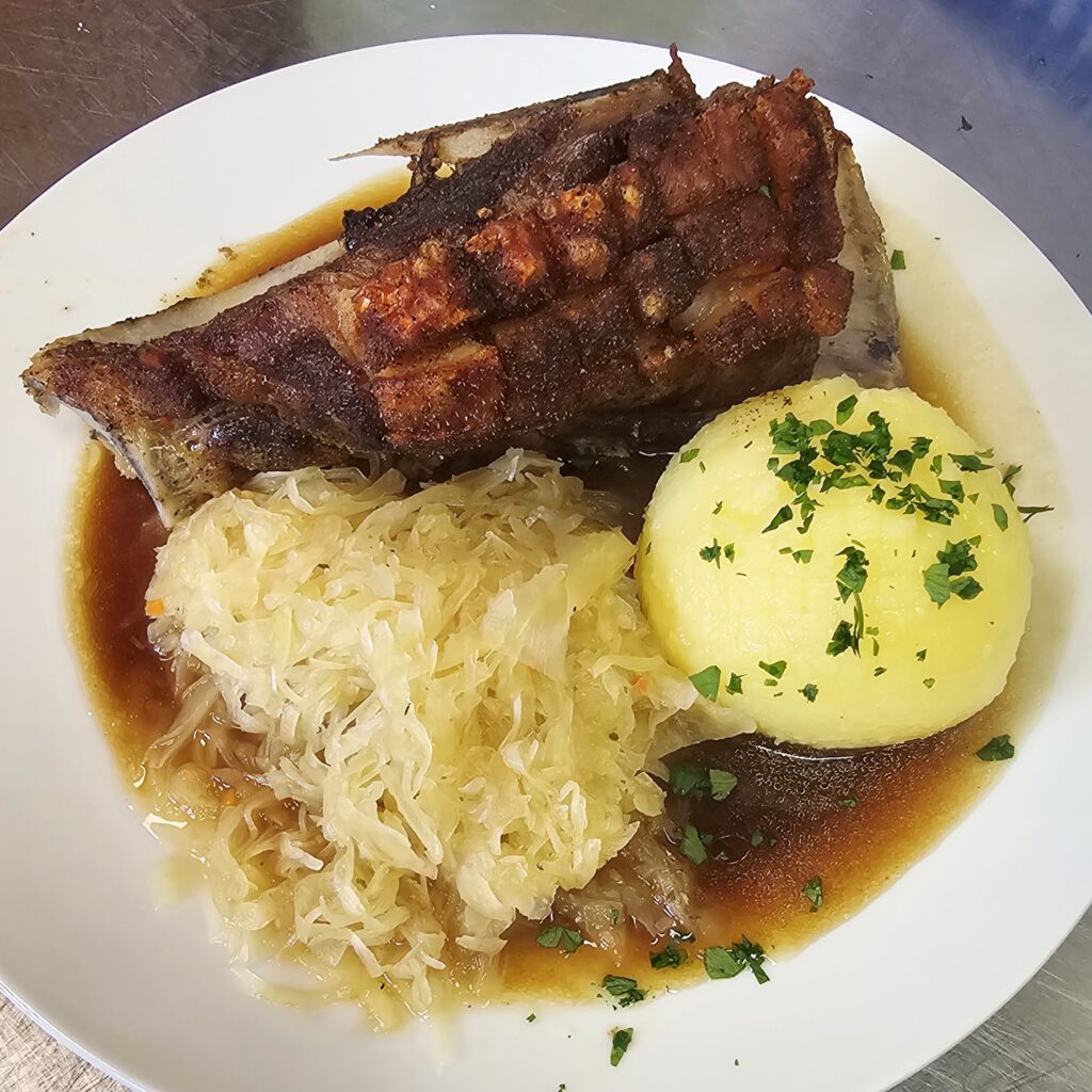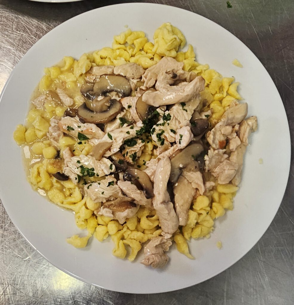Zum Mittagstisch gab es Schäuferla mit Klöß und Sauerkraut, sowie Putengeschnetzeltes mit Champignon-Rahmsoße und Spätzle. Außerdem gab es Kloß mit Soß und Käsespätzle mit Röstzwiebel.
